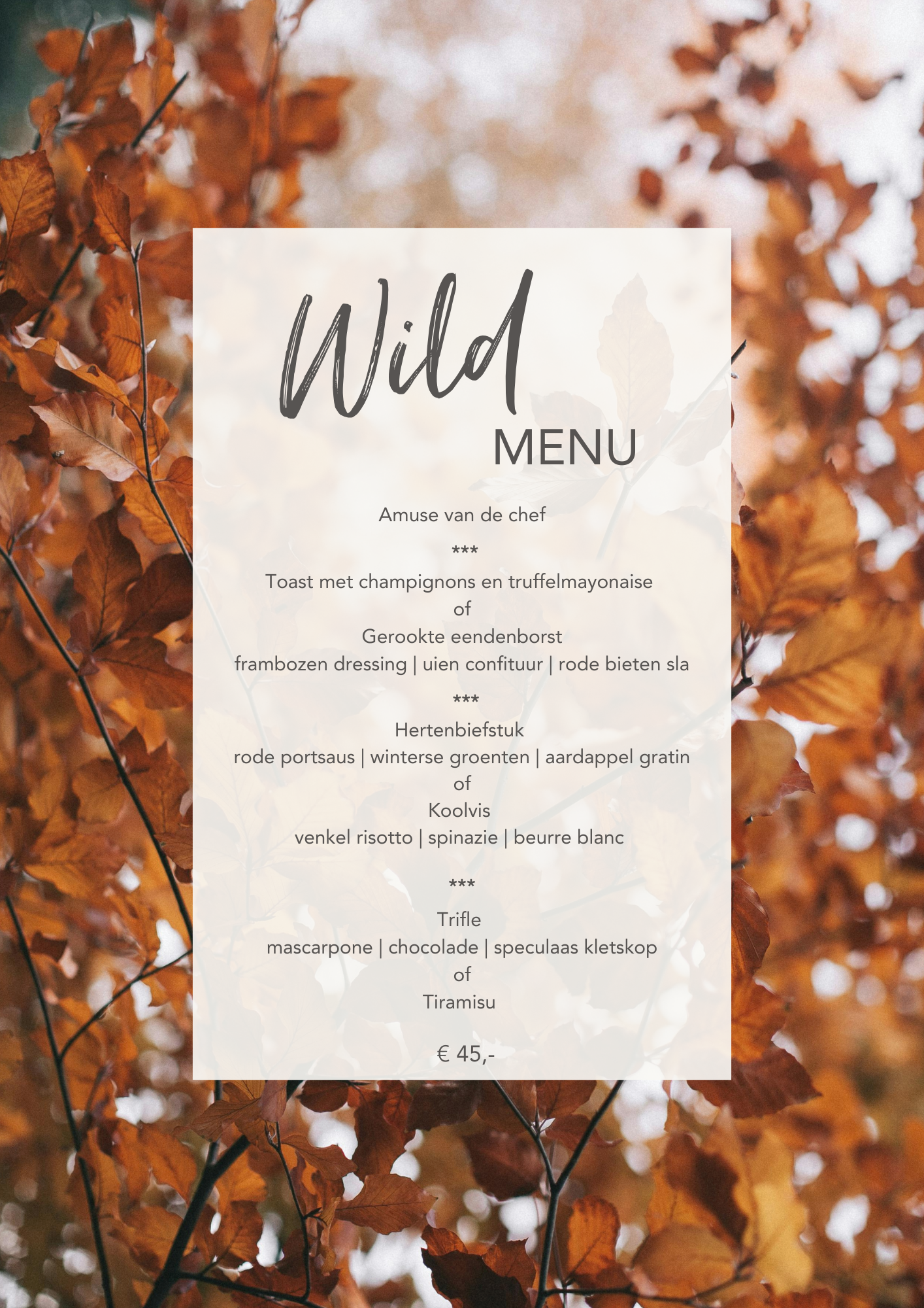 Naast ons herfstarrangement introduceren wij vanaf 17 oktober ons Wildmenu! Dit menu is volledig geïnspireerd op het seizoen en biedt een smaakvolle ervaring met pure ingrediënten en klassieke wildgerechten. Boek hier alvast je tafeltje: